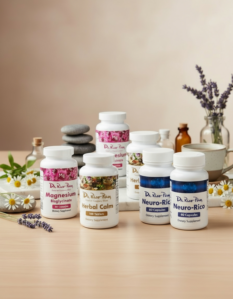 This comprehensive system includes three key supplements — Herbal Calm, Magnesium, and Neuro Rico — carefully chosen to support relaxation, focus, and nervous system balance.