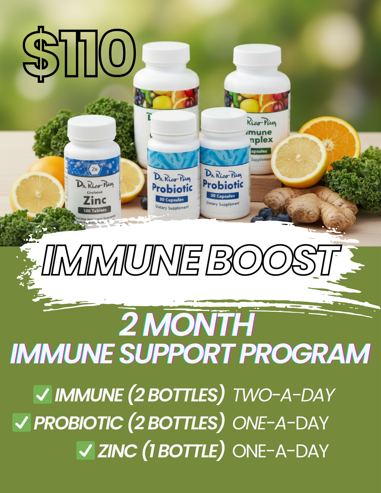 Taking Immune Complex, Probiotic, and Zinc consistently for two months can help support immune resilience, digestive balance, and overall vitality. Immune Complex is formulated with a blend of vitamins, minerals, and botanicals that work together to promote a strong immune response and protect against everyday stressors. Probiotic supports a healthy gut microbiome—an essential part of immune function—by replenishing beneficial bacteria and improving nutrient absorption.